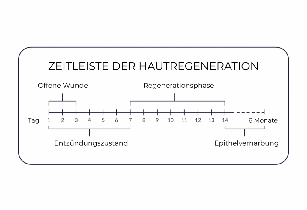 Die erste Phase dauert etwa 7–10 Tage, aber die vollständige Regeneration der Haut kann bis zu 4–6 Wochen dauern. In dieser Zeit achte auf Sauberkeit, vermeide Sonneneinstrahlung und halte die Haut regelmäßig feucht.