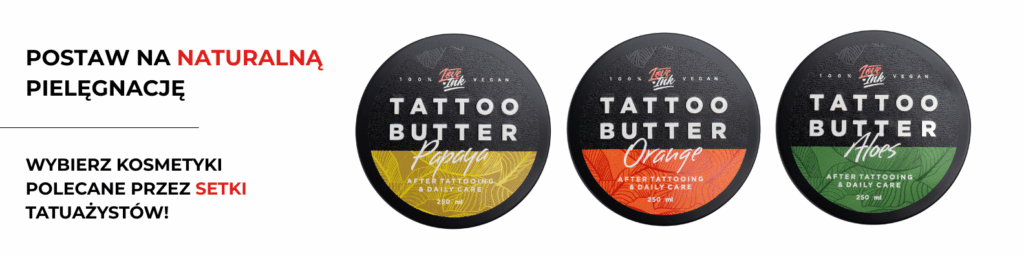 Najlepiej używać specjalistycznych kosmetyków do tatuażu, naturalnych, wegańskich i stworzonych specjalnie do pielęgnacji skóry po sesji.